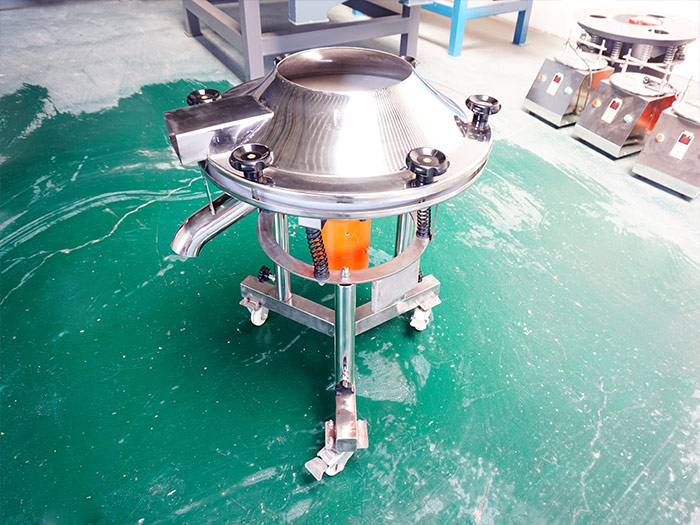 450過(guò)濾篩——直徑為450mm,由電機(jī)驅(qū)動(dòng)重錘激振,篩體產(chǎn)生水平、垂直、傾斜的三次元運(yùn)動(dòng),使含水物料在篩網(wǎng)上被拋起并由中央向外旋轉(zhuǎn)擴(kuò)散到出料口排出,含水物料在篩網(wǎng)上面的運(yùn)動(dòng)中,細(xì)小顆?;蛞后w透過(guò)篩網(wǎng),通過(guò)選擇安裝相應(yīng)的篩網(wǎng)和篩網(wǎng)層數(shù)使物料完成篩選分級(jí)或過(guò)濾,分選出的物料由各自的出料口分別自動(dòng)排出。是一臺(tái)單層篩分和過(guò)濾使用的振動(dòng)篩,被各個(gè)廠家和用戶叫做液體專用振動(dòng)篩,因?yàn)闄C(jī)身小的原因,所以它的處理量不多,適用于小產(chǎn)能要求。