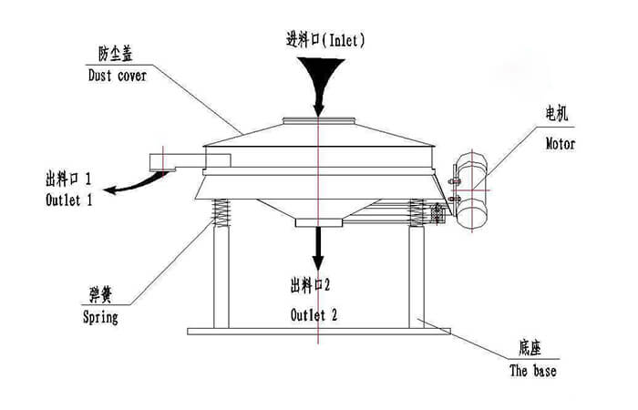 普通旋振篩:裝配一臺(tái)立式振動(dòng)電機(jī),利用立式振動(dòng)電機(jī)作為激振源,在電機(jī)的帶動(dòng)下物料在篩框做水平、垂直、傾斜的三維運(yùn)動(dòng)。通過不同目數(shù)的篩網(wǎng)過網(wǎng)完成篩分目的,具有自動(dòng)篩分排料的功能。
