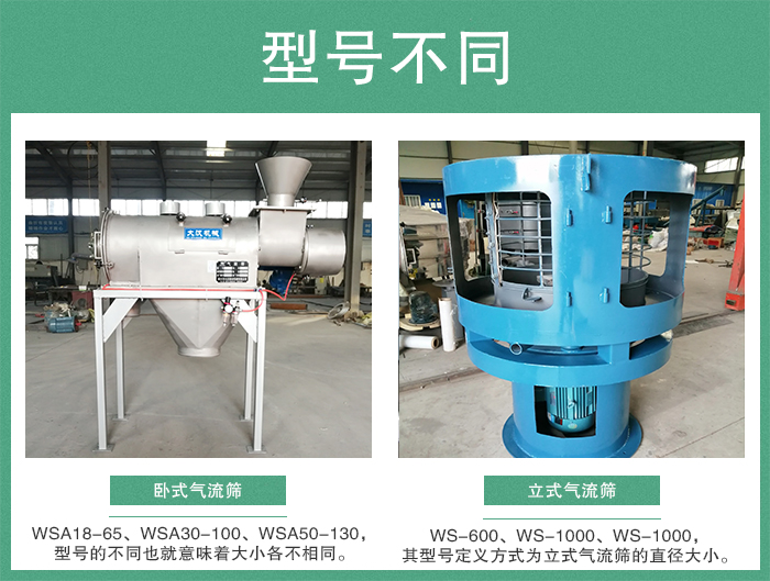 臥式氣流篩:WSA18-65、WSA30-100、WSA50-130,型號(hào)的不同也就意味著大小各不相同。