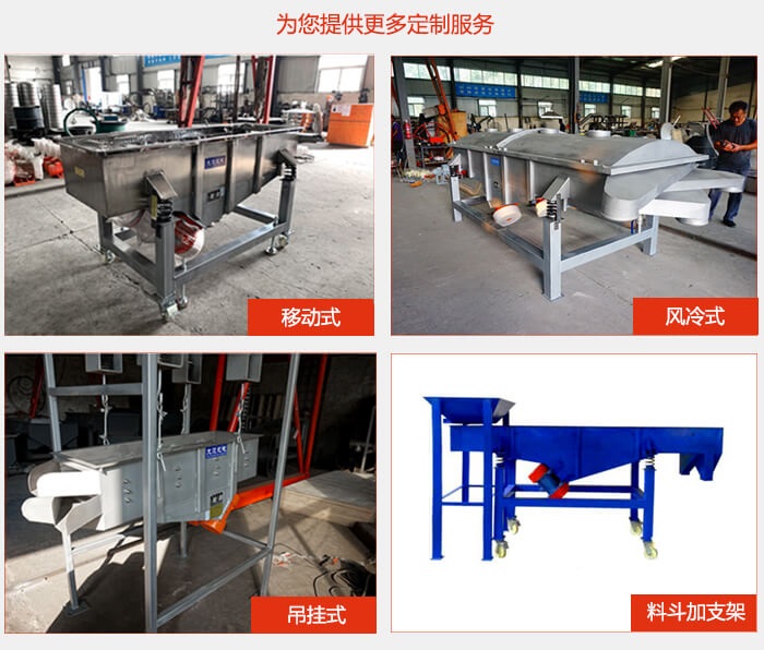 直線篩選機可根據(jù)要求采用不同的設計,如篩機的總高度、進料口角度/尺寸、出料口角度/尺寸/加閥、設備表面處理可選擇拋光或噴砂、普通電機/防爆電機等。不同設計,價格不同。