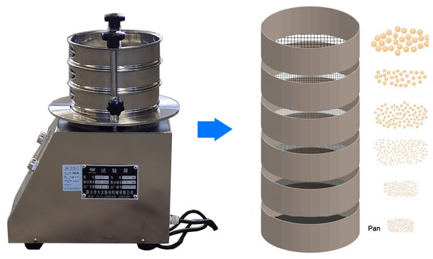 電磁試驗采用電磁振動器作為振動源,電磁振動器的振動帶動篩機低位振動,再通過底座傳遞到底座上由粗到細排列的一組標準試驗篩,同時安裝在下部的振動電機(或往復(fù)機構(gòu))將物料精選篩分,物料在標準檢驗篩的篩面上振動,使小于篩網(wǎng)孔徑的物料顆粒篩入下層檢驗篩,層層篩分,只有試驗篩的每一層都留有相同的粒徑,以達到不同的粒徑分離。