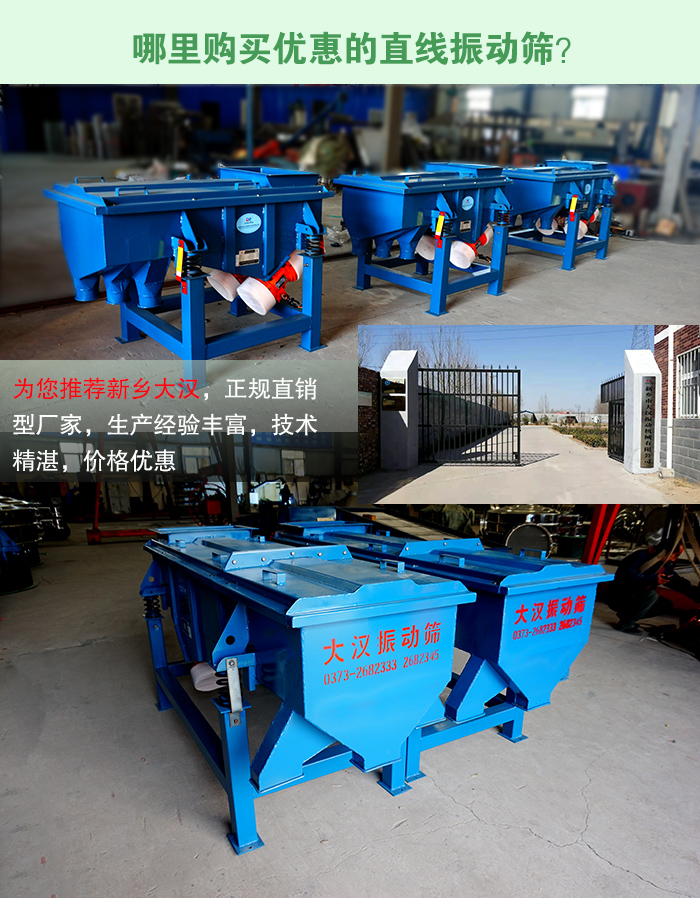 現(xiàn)提前預(yù)約,即可享受新折扣價,您也可來廠對直線振動篩進(jìn)行免費(fèi)的參觀與試機(jī),了解實(shí)際生產(chǎn)現(xiàn)場的運(yùn)行情況,大漢公司隨時期待著您的到來。