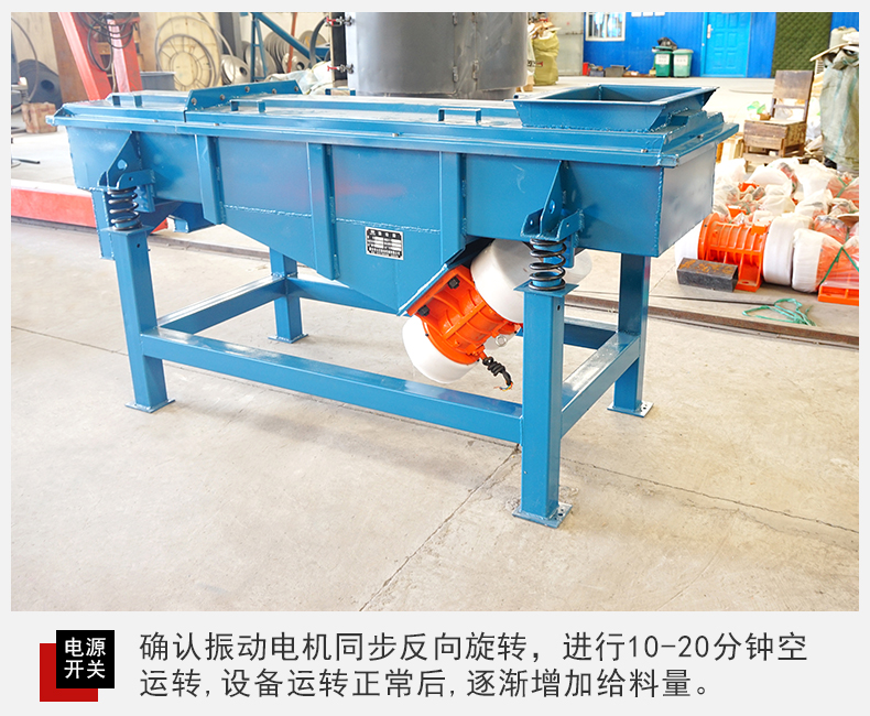 3、閉合電源開關,確認振動電機同步反向旋轉(zhuǎn),進行10-20分鐘空運轉(zhuǎn),設備在運行時如有異常聲音,應迅速關機進行檢查處理。設備運轉(zhuǎn)正常后,可將少量需篩分的物料通過進料口設入篩機內(nèi),確認物料向出料口方向行進,然后逐漸增加到所需和所能承受的給料量。