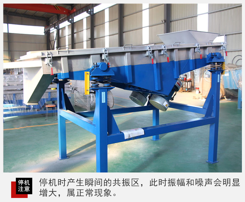 6、設備在停機時產(chǎn)生瞬間的共振區(qū),此時振幅和噪聲會明顯增大,屬正?,F(xiàn)象,設備在開停機前,篩面上不得有存留物料,篩網(wǎng)需經(jīng)常檢查是否張緊、破損,如有破損要即時更換。