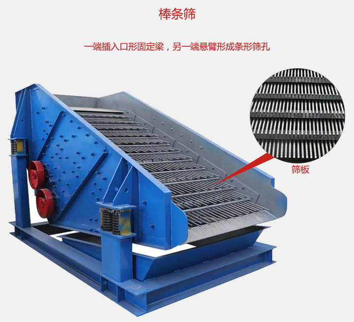 棒條篩篩面是由一組相互平行的彈簧棒條和安裝棒條的固定梁等組成的,鋼棒采用65Mn,55CrSi,60SiMn等彈簧鋼,一段插入口形固定梁,另一端懸臂形成條形篩孔,棒條的長度設計在220-360mm之間。該設備主要適用于破碎機前大塊物料的均勻給料,以及垃圾的篩分處理等行業(yè)中。