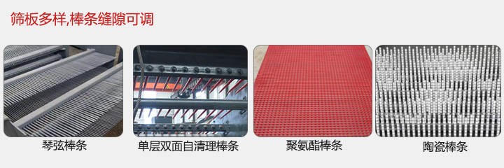 2,該設備篩板多樣:琴弦棒條,單層雙面自清理棒條,聚氨酯棒條,陶瓷棒條四類。