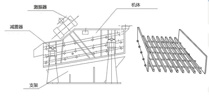 棒條篩工作時,由激振器產(chǎn)生的激振力通過篩箱傳遞給篩箱內(nèi)的篩面上,因激振器產(chǎn)生激振動力為縱向力,迫使篩箱帶動篩網(wǎng)面作縱向前后位移。在一定條件下,篩網(wǎng)面上的物料因受激振力作用而被向前拋起,落下時小于篩孔的物料則透篩而落到下層,物料在篩網(wǎng)面上的運動軌跡為拋物運動,由于這樣周而復始的物料運動,從而完成物料篩分作業(yè)。