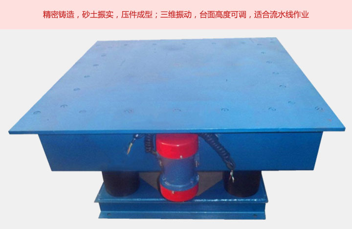 鑄造用振動平臺采用橡膠彈簧和6臺-8臺振動電機組合,具有上下,左右前后的三維振實效果,它具有多結(jié)構支撐,結(jié)構牢固,密封性好,性能可靠,操作簡單,振動頻率可調(diào)等特點。