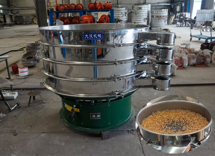 將速凍玉米倒入篩機(jī)中,在振動電機(jī)的作用下,速凍玉米在篩面上由中間向四周擴(kuò)散,期間,速凍玉米根據(jù)粒度通過篩網(wǎng),大于篩網(wǎng)尺寸的速凍玉米將停留在篩面上并從出料口排出,小于篩孔的速凍玉米將進(jìn)入下層篩網(wǎng)繼續(xù)篩分,直至被排出。